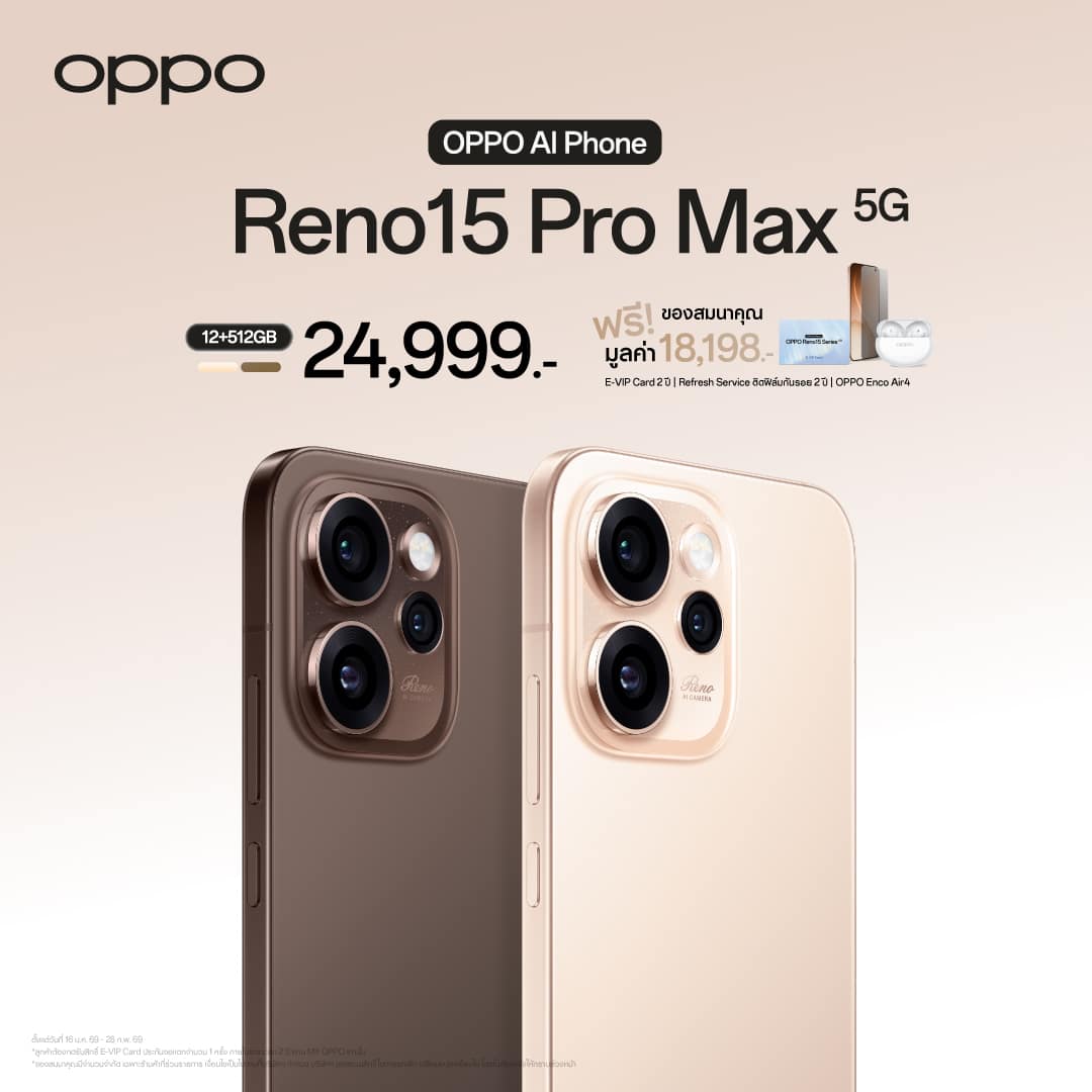 - สำหรับรุ่น OPPO Reno15 Pro Max 5G และ OPPO Reno15 Pro 5G จะได้รับ OPPO Enco Air4 มูลค่า 1,999 บาท