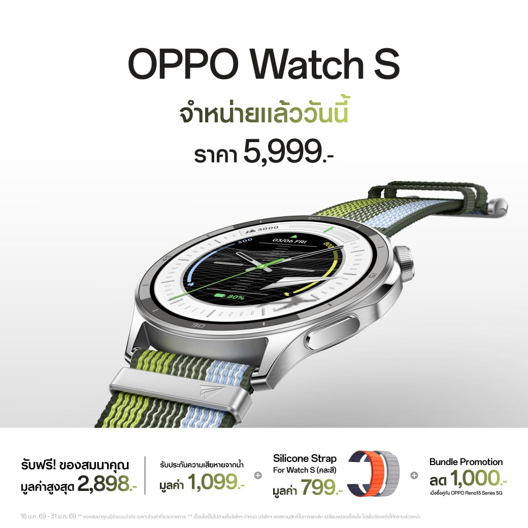 อีกทั้งยังมาพร้อม Bundle Promotion ลด 1,000 บาท เมื่อซื้อ OPPO Watch S คู่กับสมาร์ตโฟน OPPO Reno15 Series 5G