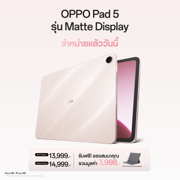 จับคู่มากับ OPPO Pad 5 แท็บเล็ตที่ยกระดับการทำงานและการเรียนให้ Smart & Smooth มากขึ้นด้วยหน้าจอขนาดใหญ่ 12.1 นิ้ว ความละเอียดสูงถึง 2.8K โดดเด่นด้วยหน้าจอแบบด้าน Anti-Glare Soft Light Display ที่ช่วยลดแสงสะท้อน ไม่แสบตา และถนอมสายตาอย่างเหนือชั้น พร้อมรองรับ Pastel Mode หรือโหมดสีหมึกที่มอบประสบการณ์การอ่านใกล้เคียงกระดาษจริง ยิ่งไปกว่านั้นยังรองรับปากกา Stylus ที่มีความหน่วงต่ำระดับแฟลกชิปและรองรับแรงกดได้หลายระดับเพื่อให้การเขียนเป็นธรรมชาติ ทั้งการจดเลกเชอร์ วาดไดอะแกรม หรือเซ็นเอกสาร ขับเคลื่อนด้วยระบบปฏิบัติการ ColorOS for Pad ที่มาพร้อม Flux Themes ใหม่ 5 แบบ ซึ่งสามารถปรับแต่งข้อความ รวมถึงฟอนต์ได้หลากหลายสไตล์ รองรับหลายภาษา และตั้งวิดเจ็ตบนล็อกสกรีนได้สูงสุด 6 ช่องพร้อมปรับขนาดนาฬิกาได้ตามต้องการ เสริมพลังด้วย AI Image-to-Text (ภาษาอังกฤษเท่านั้น) และหน้าจอหลัก Flux Home Screen ที่ช่วยจัดระเบียบอัตโนมัติ รวมถึง Fluid Cloud for Tablet ที่ปรับความกว้าง Capsule ได้และเพิ่มระยะขอบบนด้วย status bar สูง 40dp พร้อมฟีเจอร์ Split-Screen & Floating Window เพื่อช่วยเรื่องการทำงานหลากหลายในเวลาเดียวกัน อีกทั้งยังมอบอรรถรสความบันเทิงเต็มอิ่มด้วยลำโพง Quad Speaker เสียงคมชัดรอบทิศทาง ใช้งานได้ยาวนานตลอดวันด้วยแบตเตอรี่ขนาดใหญ่ 10050mAh และรองรับการเชื่อมต่อข้ามอุปกรณ์แบบ Cross-ecosystem ที่ทำงานร่วมกับทั้ง Apple, Android และ Windows ได้อย่างลื่นไหลและต่อเนื่อง เพื่อการซิงค์คอนเทนต์ข้ามอุปกรณ์และสร้างสรรค์ผลงานได้สะดวกทุกที่ทุกเวลา วางจำหน่ายในราคาเริ่มต้น 13,999 บาท