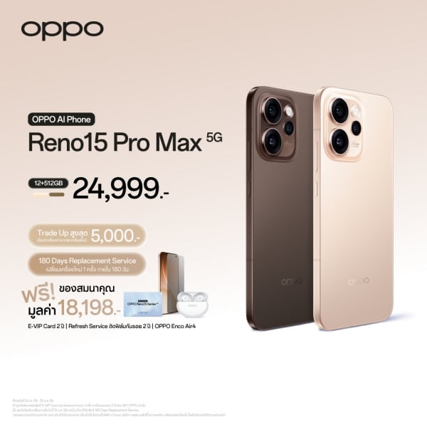 - OPPO Reno15 Pro Max 5G (12+512GB) วางจำหน่ายในราคา 24,999 บาท