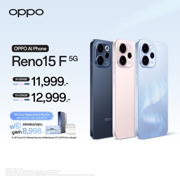 - OPPO Reno15 F 5G มาพร้อม 2 ความจุ ได้แก่ OPPO Reno15 F 5G (8+256GB) และ OPPO Reno15 F 5G (12+256GB) วางจำหน่ายในราคาเริ่มต้น 11,999 บาท