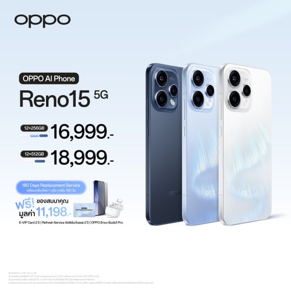 - OPPO Reno15 5G มาพร้อม 2 ความจุ ได้แก่ OPPO Reno15 5G (12+256GB) และ OPPO Reno15 5G (12+512GB) วางจำหน่ายในราคาเริ่มต้น 16,999 บาท