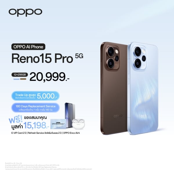 - OPPO Reno15 Pro 5G (12+256GB) วางจำหน่ายในราคา 20,999 บาท