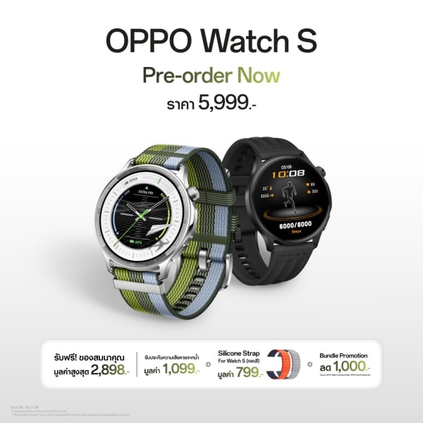 ออปโป้มอบนิยามใหม่แห่งความบางและความอัจฉริยะด้วยสมาร์ตวอตช์รุ่นล่าสุด OPPO Watch S มาพร้อมดีไซน์บางเฉียบที่สุดที่เคยมีมา ด้วยตัวเรือนที่บางเพียง 8.9 มม. และน้ำหนักเบาแค่ 35 กรัม เน้นความคล่องตัวและทันสมัย ให้ใส่สบายเหมือนไม่ได้ใส่ พร้อมเป็นโค้ชส่วนตัวบนข้อมือคุณ เพราะมีโหมดกีฬาแบบจัดเต็มมากกว่า 100 ประเภท ติดตามผลได้แบบเรียลไทม์ และโหมดโปรสำหรับ 12 กีฬายอดฮิตที่ให้ข้อมูลแม่นยำระดับมืออาชีพ ช่วยวางแผนการฝึกซ้อมที่เหมาะกับร่างกายคุณโดยเฉพาะ และยังมีฟีเจอร์ Heart Rate Broadcast ที่สามารถแชร์ข้อมูลหัวใจจากนาฬิกาไปแสดงผลบนเครื่องออกกำลังกายหรือไมล์จักรยานได้ทันที พร้อมยกระดับการดูแลสุขภาพด้วยเซนเซอร์อัจฉริยะระดับเรือธงที่ล้ำที่สุดในระดับราคาเดียวกัน ให้คุณติดตามข้อมูลร่างกายได้แม่นยำตลอด 24 ชั่วโมง เสริมด้วยนวัตกรรมอัลกอริทึมที่ OPPO คิดค้นขึ้นเอง เพื่อการดูแลสุขภาพทั้งทางกาย ใจ และการนอนหลับ รวมถึงฟิตเนสที่แม่นยำและน่าเชื่อถือยิ่งกว่าเดิม สามารถเชื่อมต่อได้ถึง 2 เครื่องพร้อมกัน เพื่อให้ไม่พลาดทุกการสื่อสาร ทั้งการรับสาย อ่านข้อความ และแจ้งเตือนการนัดหมายต่าง ๆ รองรับทั้งระบบปฏิบัติการ Android และ iOS พร้อมมอบประสิทธิภาพการใช้งานสุดลื่นไหลระดับเรือธง โดย OPPO Watch S มาใน 2 สีคลาสสิก แมชต์เข้าได้กับทุกชุด ได้แก่ สีเงิน Silver Gleam พร้อมสายในลอนถัก และสีดำ Phanthom Black พร้อมสายยางฟลูโอโรอีลาสโตเมอร์ วางจำหน่ายในราคา 5,999 บาท