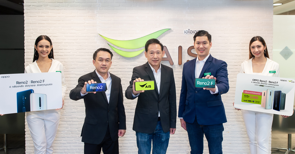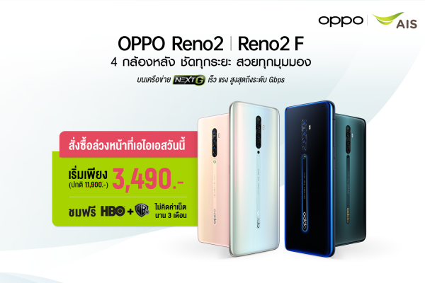 AIS มอบโปรโมชั่นสุดพิเศษให้แก่ผู้ใช้ โดย OPPO Reno2 F มอบส่วนลดค่าเครื่องสูงสุด 8,500 บาท เหลือเพียง 3,490 บาท จากปกติ 11,990 บาท เมื่อสมัครแพ็กเกจรายเดือน 1,149 บาทขึ้นไป และสำหรับ OPPO Reno2 มอบส่วนลดค่าเครื่องสูงสุด 9,000 บาท เหลือเพียง 8,990 บาท จากปกติ 17,990 บาท เพียงสมัครแพ็กเกจรายเดือน 1,149 บาทขึ้นไป โดย AIS พร้อมเปิดจองแล้วที่เอไอเอสช็อปและร้านเทเลวิซทุกสาขา ตั้งแต่วันนี้ – 23 ตุลาคม 2562 รับเครื่องระหว่างวันที่ 26 ต.ค. 62 – 31 ต.ค. 62