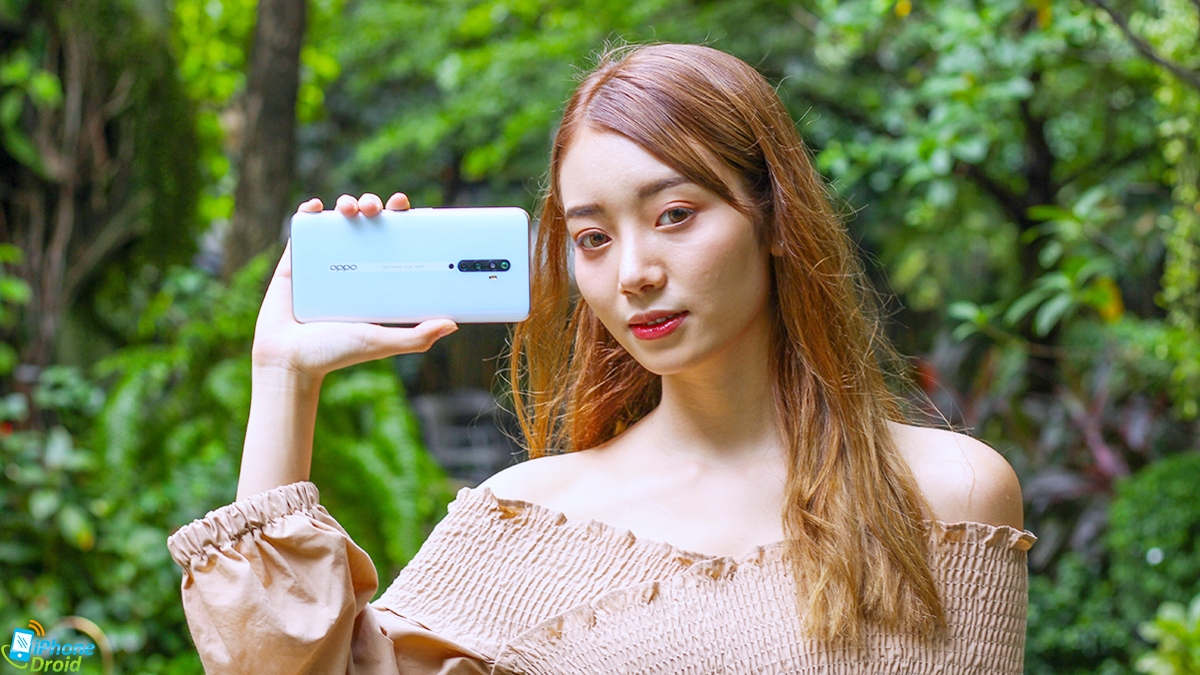 - OPPO Reno2 F มีดีไซน์ที่สวยงามในสี Sky White ตัวเครื่องมีมิติ และครอบทับด้วยกระจก Gorilla Glass 5 ทั้งด้านหน้าและหลัง