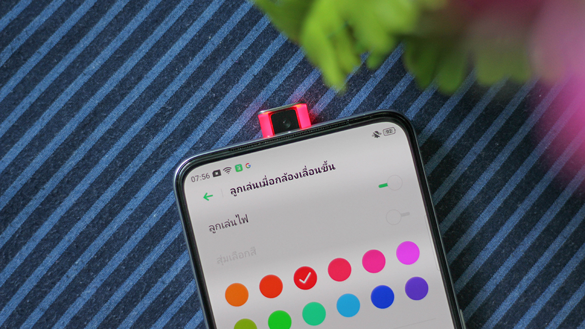 สำหรับกล้องหน้า Rising Camera ของ OPPO Reno2 F นั้นมีลูกเล่นที่แสงและสีด้วย คือ Atmosphere Light ที่สามารถปรับสีได้ถึง 12 สี เช่น สีแดง, ส้ม, น้ำเงิน, เขียว เป็นต้น ซึ่งส่วนนี้ไม่ได้ทำมาเพื่อความสวยงามเท่านั้น แต่ยังช่วยเรื่องการถ่ายเซลฟี่ให้ง่ายขึ้นมาก ทั้งสามารถกระพริบได้ตามการนับถอยหลัง โดยจะเป็นการกระพริบ 1 วินาทีต่อ 1 ครั้งครับ นับถอยหลัง 3 วินาที ก็กระพริบ 3 ครั้ง เป็นต้น