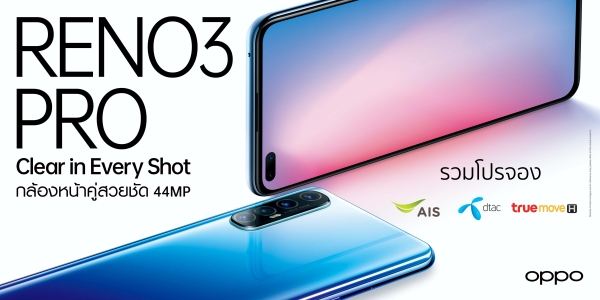 ออปโป้มอบโปรโมชั่นเด็ดกับ OPPO Reno3 Pro กล้องหน้าคู่สวยสุดชัดสุด 48MP ในราคาเริ่มต้นเพียง 11,990 บาท! พร้อมของสมนาคุณมูลค่ารวม 7,490 บาทเมื่อจองผ่านทรูมูฟเอช