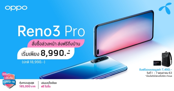 โดยครั้งนี้ OPPO ได้ผนึกกำลังกับดีแทค จัดโปรโมชั่นสุดคุ้มมอบส่วนลดสูงสุด 10,000 บาท เมื่อจอง OPPO Reno3 Pro พร้อมแพ็คเกจที่กำหนด โดยเริ่มต้นเพียง 8,990 บาท จากปกติ 18,990 บาท พร้อมรับฟรี OPPO E-VIP Service รับประกันหน้าจอนาน 1 ปี และ OPPO Backpack มูลค่ารวม 7,490 บาท และรับของแถมเพิ่มอีกหนึ่งต่อ ฟรีประกัน COVID-19 และเล่นแอปโซเชียลฟรีไม่อั้นเมื่อจองกับ ดีแทค โดยสามารถจองได้แล้วตั้งแต่วันที่ 1 พฤษภาคม 2563 – 7 พฤษภาคม 2563 ที่ศูนย์บริการดีแทคทั่วประเทศ และ dtac online store เร็วๆ นี้ ลูกค้าสามารถติดตามรายละเอียดโปรโมชั่นเพิ่มเติมได้ที่https://www.dtac.co.th/oppo/oppo-reno-3pro.htmlอย่ารอช้าของแถมมีจำนวนจำกัด