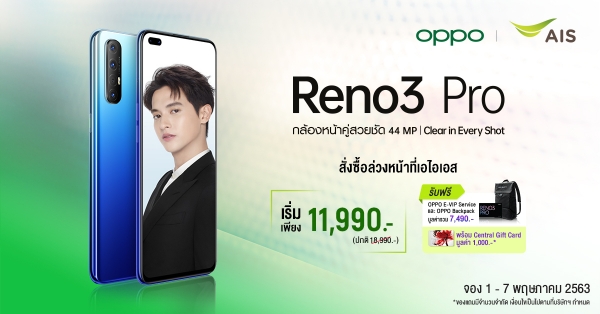 โดยลูกค้าเอไอเอสสามารถจองสมาร์ทโฟนกล้องหน้าคู่สวยชัดสุด OPPO Reno3 Pro ในราคาเริ่มต้นเพียง 11,990 บาท! จากราคาปกติ 18,990 บาท และรับฟรี OPPO E-VIP Service รับประกันหน้าจอนาน 1 ปี, กระเป๋าสุดเท่ OPPO Backpack และ Central Gift Card มูลค่ารวมถึง 8,490 บาท พร้อมรับเพิ่มฟรี! สิทธิดู AIS PLAY FAMILY ฟรี 6 เดือน* โดยสามารถจองได้แล้วตั้งแต่วันที่ 1 – 7 พฤษภาคม 2563 ทาง เว็บไซต์www.ais.co.th/opporeno3, AIS Online Store, Line@AISShop หรือที่ AIS Shop และร้านเทเลวิซทุกสาขาทั่วประเทศ โดยจะได้รับสินค้าตั้งแต่วันที่ 8 พฤษภาคม 2563 เป็นต้นไป ทั้งนี้ สามารถรับข้อเสนอสุดเอ็กซ์คลูซีฟกับเอไอเอส เฉพาะช่วงสั่งซื้อเครื่องล่วงหน้าเท่านั้น! สอบถามข้อมูลเพิ่มเติมที่ AIS Contact Center 1175