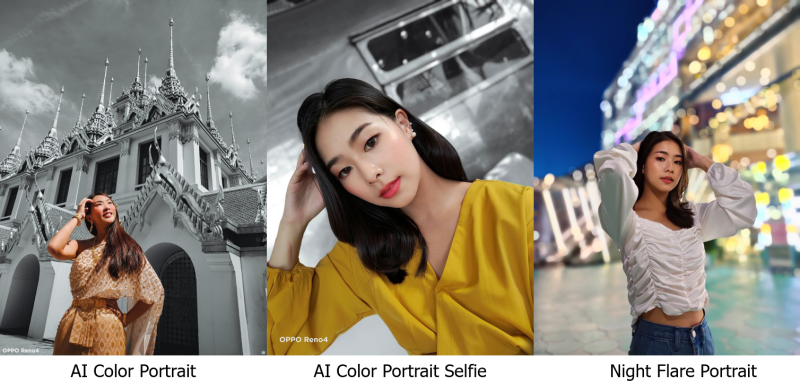 OPPO Reno4 มาพร้อมกับ 4 กล้องหลัง ความละเอียดสูงสุด 48MP และกล้องหน้าความละเอียด 32MP สามารถถ่ายภาพได้โดดเด่นมากยิ่งขึ้นด้วยฟีเจอร์ AI Color Portrait ที่เปลี่ยนสีฉากหลังให้เป็นสีขาว–ดำ โดยตัวบุลคลยังมีสีสันอยู่ สามารถถ่ายได้ทั้งกล้องหน้าและกล้องหลัง ทำได้ทั้งภาพนิ่งและวิดีโอ, Night Flare Portrait เพิ่มลูกเล่นโบเก้ให้หน้าชัดหลังเบลอแบบเป็นธรรมชาติและมีมิติ นอกจากนี้ OPPO Reno4 มีฟีเจอร์การถ่ายวิดีโอกล้องหลังแบบ 960fps AI Slow-motion และระบบกันสั่น Ultra Steady Mode 3.0 และกล้อง Ultra Wide-angle เพื่อถ่ายวิดีโอได้นิ่งในมุมมองที่กว้างขึ้น ให้คุณสามารถเก็บทุกโมเมนต์สุดประทับใจได้อย่างง่ายดาย