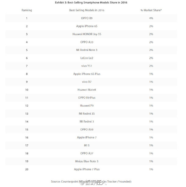 สำหรับรุ่นสมาร์ทโฟนที่ติดอันดับท็อปในประเทศจีนในปี 2016 เริ่มจากอันดับ 1 เป็นรุ่น OPPO R9 ที่มีส่วนแบ่งทางการตลาด 4% ตามมาด้วย Apple iPhone 6s และอันดับ 3 เป็นรุ่น Huawei Honor Joy 5s ซึ่งจุดน่าสนใจคือมีสมาร์ทโฟนแบรนด์ต่างชาติเพียงแบรนด์เดียวที่ติดท็อป 20 นั่นก็คือ Apple นอกนั้นเป็นแบรนด์เจ้าถิ่นทั้งหมด