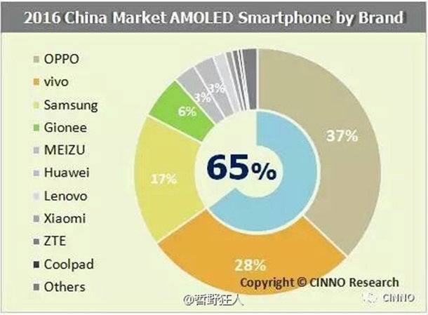 หากดูข้อมูลส่วนแบ่งทางการตลาดสมาร์ทโฟนที่มีหน้าจอแบบ AMOLED แต่ละแบรนด์ในประเทศจีนในปี 2016 พบว่า OPPO มีส่วนแบ่งทางการตลาดมากที่สุดถึง 37% หรือเรียกได้ว่าเป็นแบรนด์ที่มีสมาร์ทโฟนหน้าจอแบบ AMOLED มากที่สุดนั่นเอง