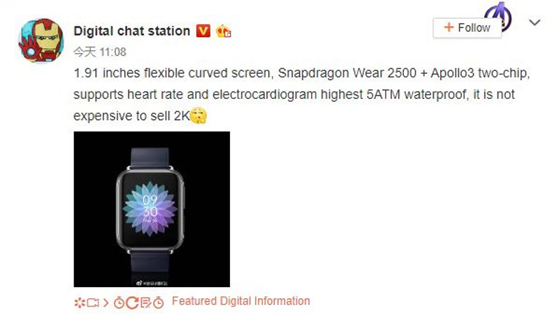 บัญชี Digital Chat Station ใน Weibo เผยว่า OPPO Watch จะมาพร้อมหน้าจอโค้งชนิด OLED ขนาด 1.91 นิ้ว พร้อม 326ppi และสี 100% DCI-P3 โดยจะมีหน่วยประมวลผล Snapdragon Wear 2500 ควบคู่กับ Apollo 3 มาเป็นตัวช่วย ทั้งยังรองรับเซ็นเซอร์วัดอัตราการเต้นของหัวใจด้วยไฟฟ้าหรือ ECG และป้องกันน้ำระดับ 5ATM