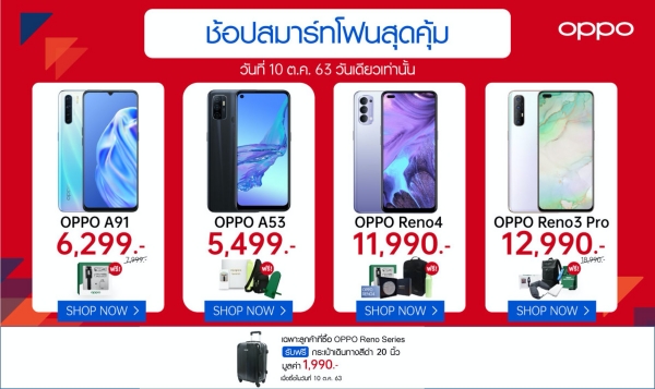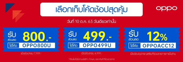 สามารถซื้อสมาร์ทโฟน OPPO หรืออุปกรณ์เสริม ได้คุ้มมากขึ้น จากการเก็บโค้ดส่วนลดสูงสุด 1,000 บาท หรือ ส่วนลด 12% สำหรับอุปกรณ์เสริมที่ร่วมรายการ โดยสามารถเก็บโค้ดได้ตั้งแต่วันที่ 1 ตุลาคม 18.00 และ สามารถใช้โค้ดได้เฉพาะวันที่ 10 ตุลาคม เท่านั้น โดยโค้ดมีจำนวนจำกัด