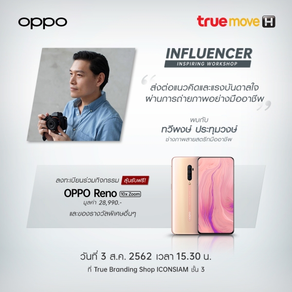 OPPO จับมือกับ TrueMove H จัดกิจกรรม Influencer Inspiring Workshop พบกับช่างภาพสายสตรีทแถวหน้าของไทย “คุณทวีพงษ์ ประทุมวงษ์” พร้อมลุ้นรับ OPPO Reno 10x Zoom Sunset Rose Limited Edition มูลค่า 28,990 บาท!!”