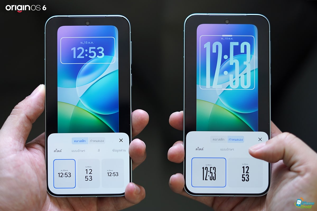 อย่างในหน้าจอล็อค ก็จะมีตัวเลือกให้ปรับแต่งเยอะขึ้นมาก ทั้งรูปแบบนาฬิกา ที่มีแบบคลาสสิก เป็นฟอนต์มาตรฐาน เลือกแบบอักษร สีสันหรือใส่ข้อมูลด่วนได้ หรือถ้าอยากได้ความสดใหม่ ก็จะมีรูปแบบกำหนดเอง ที่ใช้แบบอักษรใหม่ ให้เรายืดขนาดของนาฬิกาได้เพิ่มเติม ปรับสีปรับรูปแบบได้อีกเช่นกันครับ