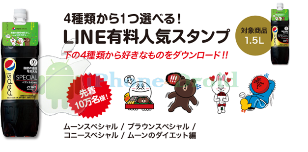 สำหรับเป๊บซี่ขนาด 490 มิลลิลิตร รับฟรีสติ๊กเกอร์ PEPSI SPECIAL × LINE Characters ดาวน์โหลดได้ตั้งแต่วันที่ 1 ตุลาคม ถึง 24 ธันวาคม 2556 ระยะเวลาการใช้งาน 365 วัน นับตั้งแต่วันที่ดาวน์โหลด