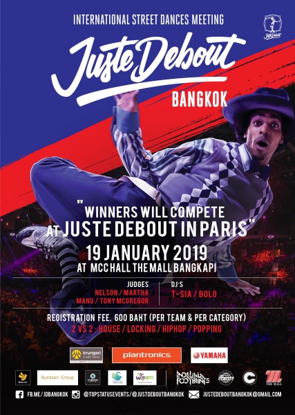 Juste Debout เรียกว่าเป็นอีกหนึ่งเวทีล่าฝันของเหล่าสายแดนซ์ สำหรับการแข่งขันเต้นระดับโลก ที่โด่งดังมาตั้งแต่ปี 2002 โดยในปีนี้ประเทศไทยคว้าลิขสิทธิ์เป็นผู้จัดการแข่งขันอย่างเป็นทางการในแถบเอเชียตะวันออกเฉียงใต้ ในรายการ Juste Debout Bangkok 2019 (จัส เดอบู แบงค็อก 2019) เพื่อเปิดฟลอร์ให้ ผู้ที่มีใจรักการเต้นแนว Street Dance ได้มีพื้นที่แสดงความสามารถกันอย่างเต็มที่ โดยใช้ศาสตร์การเต้น 4 ประเภทคือ Hip Hop, Locking, Popping และ House มาประชันศึกกันอย่างดุเดือด เพื่อเฟ้นหาสุดยอดนักเต้น 4 ทีมสุดท้าย จากผู้สมัครทั้งหมด 250 ทีม เป็นตัวแทนประเทศไทยไปแข่งขันชิงแชมป์โลกในรายการ “Juste Debout Paris 2019” ที่ประเทศฝรั่งเศส