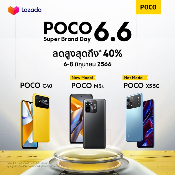 - สมาร์ทโฟน POCO อื่นๆมากมาย นำขบวนโดย POCO F5 Series และ POCO C40 มอบโปรโมชันพิเศษ* บน Shopee ในระหว่าวันที่ 6-7 มิถุนายน 2566 และ บน Lazada ในระหว่างวันที่ 6-8 มิถุนายน 2566