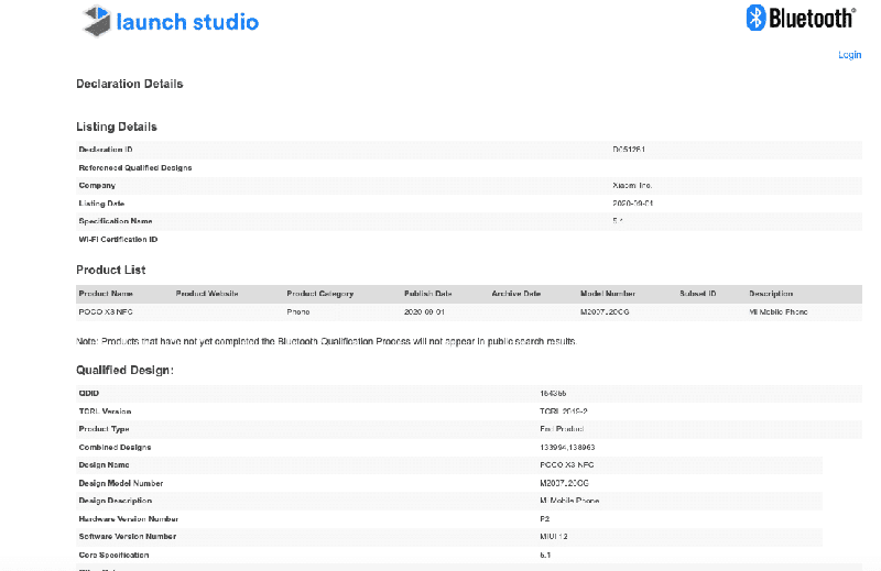 สำหรับ POCO X3 นั้นผ่านการรับรองจาก Bluetooth SIG แล้วเรียบร้อย ในโมเดลรุ่น M2007J20CG