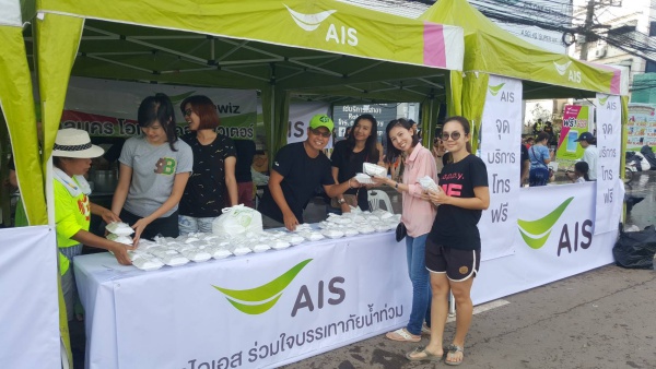 “เอไอเอส ร่วมใจบรรเทาภัยน้ำท่วม” บริเวณถนนสุขเกษม จ.สกลนคร เพื่อมอบอาหาร และน้ำดื่ม ให้แก่ผู้ประสบอุทกภัย รวมทั้งอำนวยความสะดวกด้านการสื่อสาร โดยเปิดให้บริการโทรฟรี และชาร์ตแบตเตอรี่มือถือได้ภายในเต็นท์ด้วย