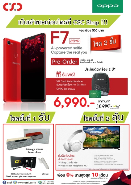 โชคชั้นที่ 2 ลุ้น! เมื่อจอง OPPO F7 จาก CSC ทุกสาขา และรับเครื่องระหว่างวันที่ 25-26 เม.ย.61 จงฟัง!!