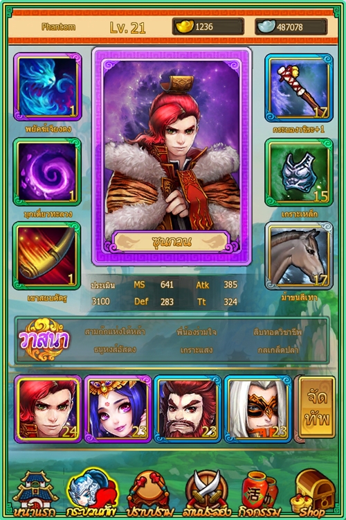 ขุนพลสามก๊กเป็นกำลังหลักที่สำคัญอย่างมากในการพาคุณสู่ชัยชนะ ในเกมมีการ์ดขุนพลนับร้อยแบบให้คุณเลือก โดยการ์ดแต่ละใบจะมีคุณภาพและคุณสมบัติที่แตกต่างกัน มีขุนพลดี มีชัยไปกว่าครึ่ง!