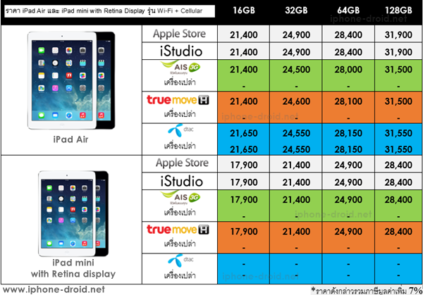 สอบถามรายละเอียดเพิ่มเติมได้จากช้อปต่าง ๆ และสำหรับ iPad Air และ iPad mini with Retina display รุ่น Wi-Fi สามารถหาซื้อได้ตามร้าน iStudio, Power Mall, Power Buy และช้อปต่าง ๆ ทั่วประเทศ