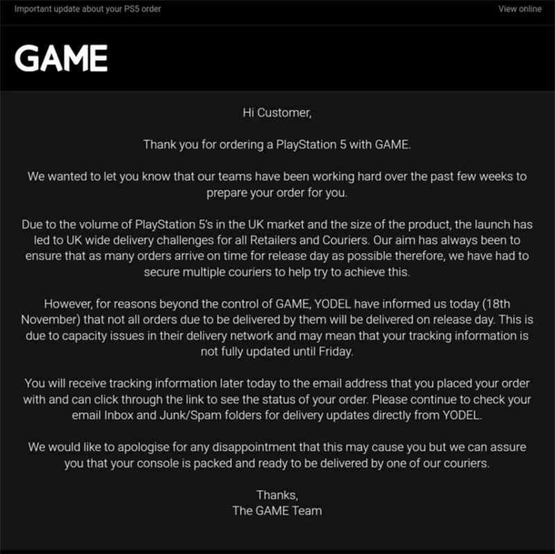บริษัท Game ได้ส่งประกาศให้กับผู้ค้าที่สั่งซื้อเครื่อง PS5 ใน UK ว่า “เนื่องด้วยปริมาณของ PlayStation 5 ในตลาด UK ที่สั่งในจำนวนมากและตัวเครื่องขนาดใหญ่ของผลิตภัณฑ์ ทำให้การขนส่งนั้นต้องเจอกับความลำบาก” อย่างไรก็ตาม Game ก็ได้ต่อว่าไปถึงผู้ให้บริการขนส่งอย่าง Yodel ด้วยเช่นกันว่ามีปัญหาในการจำนวนของการขนส่ง