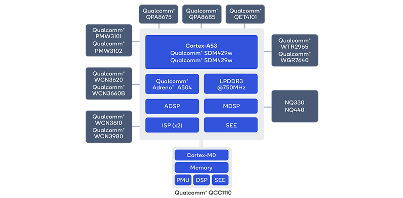 Snapdragon Wear 4100+ มาพร้อมกับหน่วยประมวลผลรองอย่าง Always-On (AON) เพื่อประหยัดพลังงานลง ควบคู่กับชิปต่างๆ ทั้ง PMIC, RF สำหรับโมเด็ม และ GPS, Wi-Fi a/b/g/n/, Bluetooth 5.0, และ RFFE ขณะที่รุ่น Wear 4100 จะต่างกันที่ไม่มีชิป Always-On (AON)