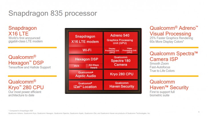 Snapdragon 835 มีซีพียู Kryo 280Octa-core แบ่งการทำงานออกเป็น 2 ระดับ คือ 4 x Kryo 280 ความเร็ว 2.45GHz สำหรับการประมวลผลสูงสุด และ 4 x Kryo 280 ความเร็ว 1.90GHz สำหรับการประมวลผลทั่วไปเพื่อประหยัดพลังงาน และด้วยกระบวนการผลิต 10 นาโนเมตร FinFET ทำให้ชิปประมวลผลตัวใหม่นี้มีขนาดเล็กลงกว่าเดิม 35% และใช้พลังงานน้อยลง 25% เมื่อเทียบกับ Snapdragon 820