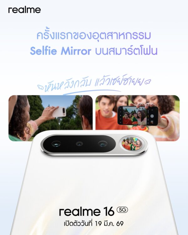 เตรียมสัมผัสความงามของ Aurora Wings Design แบบเต็มตา พร้อมฟีเจอร์ระดับแฟล็กชิปอีกมากมายของ “realme 16 5G” และ realme 16 Pro 5G, realme 16 Pro 5G และผลิตภัณฑ์ IOT อาทิ realme Buds T500 Pro และ realme Pad 3 ในงานเปิดตัวอย่างเป็นทางการ วันที่ 19 มีนาคม 2569 สามารถรับชมการถ่ายทอดสดในทุกแพลตฟอร์มทั้ง Facebook, YouTube และ TikTok ของ realme Thailand ตั้งแต่เวลา 16.00 น. เป็นต้นไป – รอติดตามกันได้เลย!ติดตามรายละเอียดรวมถึงข่าวสารกิจกรรมต่าง ๆ จาก realme Thailand ผ่านช่องทาง