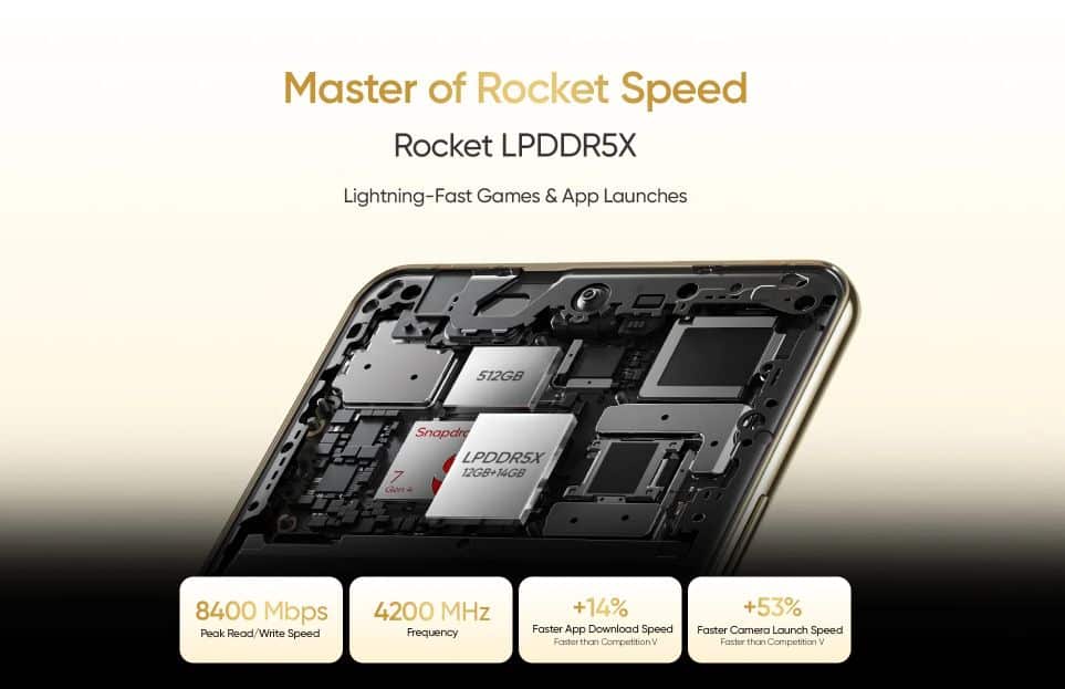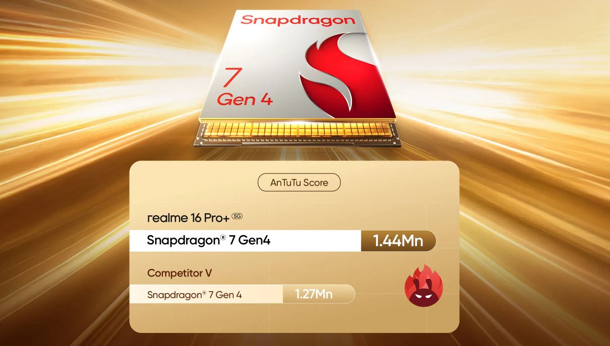 realme 16 Pro+ ยืนยันใช้ชิปเซ็ต Snapdragon 7 Gen 4 โดยเคลมว่าจะได้คะแนนการทดสอบ AnTuTu มากถึง 1.44 ล้านแต้ม ขณะที่ตัวเลือกความจุสูงสุดจะเป็นรุ่น RAM 12GB LPDDR5X + ROM 512GB