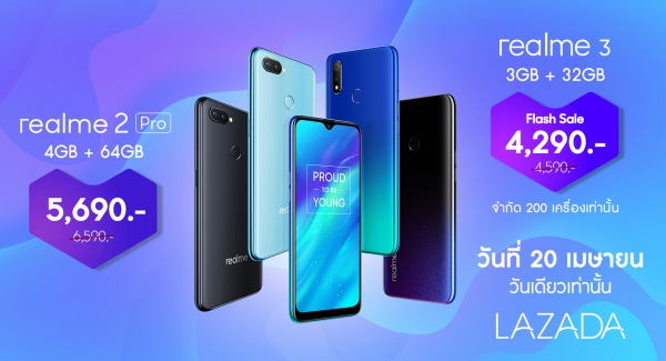 โดยตั้งแต่วันที่ 20 เมษายน เป็นต้นไป realme 3 รุ่น 3+32 GB สี Dynamic Black และ สี Radiant Blue จะมีวางจำหน่ายผ่านลาซาด้าอย่างเป็นทางการ และเพื่อเป็นการขอบคุณการรอคอยจากทุกท่าน ทาง realme ได้จัดจำหน่าย realme 3 รุ่น 3+32 GB ในราคาพิเศษ เพียงแค่ 4390 บาท (จากปกติ 4,590 บาท) เท่านั้นยังไม่พอยังมีราคาพิเศษช่วง Flash Sale เริ่มตั้งแต่เที่ยงคืนของวันที่ 20 เมษายนเป็นต้นไป realme 3 รุ่น 3+32 GB จะจำหน่ายเพียงแค่ 4290 บาทเท่านั้น (จากปกติ 4,590 บาท) และจำกัดจำนวนเพียงแค่ 200 เครื่อง