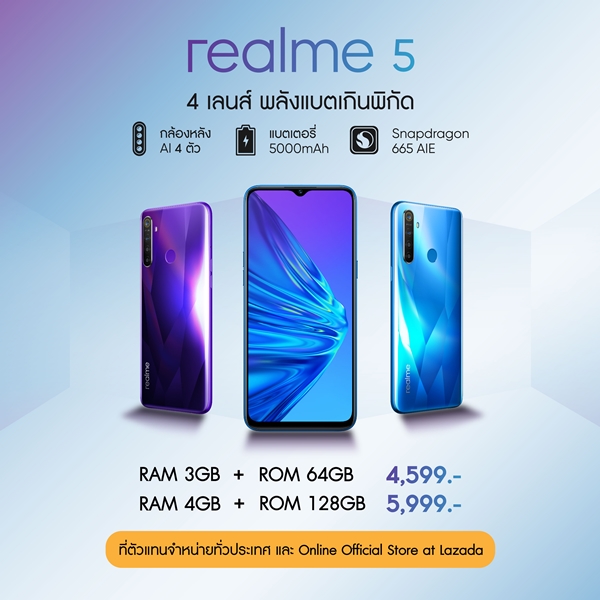 หากใครที่ไม่อยากพลาดความคุ้มค่าแบบนี้ สามารถซื้อ realme 5 ได้ที่ True, Dtac, Com7, CSC, TG fone, Jaymart และ ตัวแทนจำหน่ายทั่วประเทศ รวมถึงช่องทางอีคอมเมิร์ซ Lazada โดยเริ่มจำหน่ายวันแรกในวันที่ 21 กันยายนนี้พร้อมกันทั่วประเทศ รายละเอียดเพิ่มเติมสามารถเข้าไปดูได้ที่ https://www.facebook.com/realmeTH/