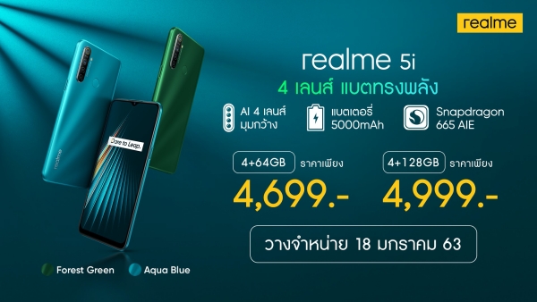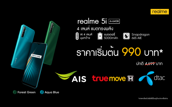 พิเศษ! สำหรับลูกค้า AIS, TrueMove H และ DTAC สามารถเป็นเจ้าของ realme 5i ความจุ 4+64 GB ในราคาเริ่มต้นเพียง 990 บาท