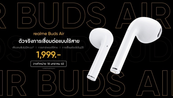 นอกจากนี้ realme ยังเปิดตัวไอเท็มสุดพิเศษ realme Buds Air หูฟังไร้สายที่มาพร้อมสโลแกน “ตัวจริงการเชื่อมต่อแบบไร้สาย” ที่จะช่วยสร้างอรรถรสเสียงของคุณให้มีคุณภาพและยกระดับการใช้ชีวิตของคุณให้ง่ายมากขึ้น การันตีความแรงโดยรางวัลยอดขายอันดับ 1 จาก Flash Sale ใน Shopee และ Lazada พร้อมวางจำหน่ายในวันที่ 18 มกราคมนี้ ในราคาเพียง 1,999 บาท ที่ realme Brand Shop ช่องทางออนไลน์ที่ Lazada และ Shopee