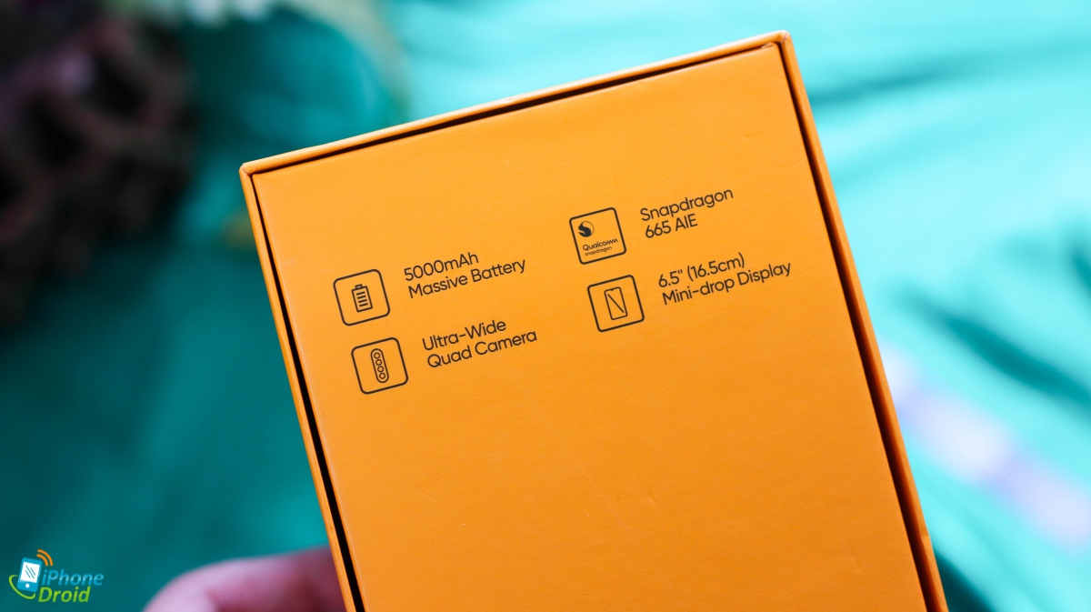 ตัวกล่องของ realme 5i มาในสีเหลืองสีประจำแบรนด์ทุกส่วนทั้งด้านหน้าและด้านหลังครับ พร้อมด้วยชื่อรุ่น 5i แบบชัดๆ ที่ด้านหน้า โดยหลังกล่องจะมีสเปคหลักๆ เช่น แบต 5000mAh, Snapdragon 665 AIE, เลนส์ Ultra-Wide Angle และหน้าจอ Mini-drop ขนาด 6.5 นิ้ว ส่วนอุปกรณ์ภายในกล่องจะมีให้ดังนี้