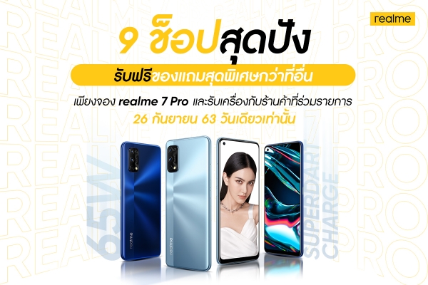 realme แบรนด์สมาร์ทโฟนเพื่อคนรุ่นใหม่ที่เติบโตเร็วที่สุดในโลก เตรียมแจกหนัก จัดเต็ม เอาใจสายช้อปในวันหยุดสุดสัปดาห์นี้กับ 9 ช้อป 9 ห้างสรรพสินค้าทั่วประเทศ จาก 4 ช่องทางยักษ์ใหญ่และ realme Brand Shop เพียงจอง realme 7 Pro และรับเครื่องกับร้านที่ร่วมรายการ รับฟรีของแถมสุดพิเศษกว่าที่อื่น มูลค่ารวมกว่า 580,000 บาท ในวันที่ 26 กันยายนนี้ วันเดียวเท่านั้น