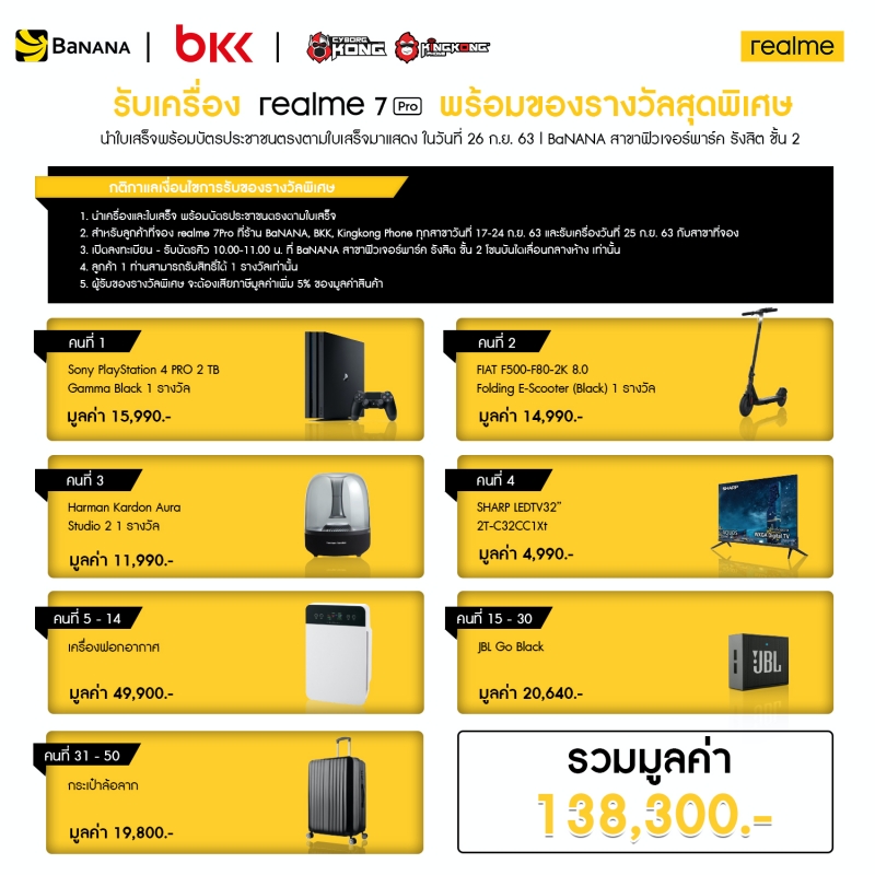 สำหรับลูกค้าที่จอง realme 7 Pro ที่ BaNANA, BKK, KingKongPhone เพียงนำใบเสร็จพร้อมบัตรประชาชนตรงตามใบเสร็จมาแสดง ที่ BaNANA สาขาฟิวเจอร์พาร์ค รังสิต ชั้น 2 ในวันที่ 26 กันยายนนี้ 50 ท่านแรกลุ้นรับของรางวัลใหญ่ Sony PlayStation 4 PRO 2 TB Gamma Black และรางวัลอื่นๆรวมมูลค่ามากกว่า 138,300 บาท