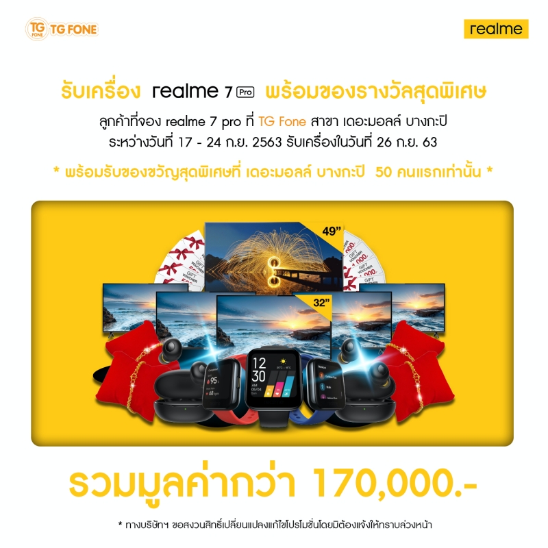 สำหรับลูกค้าที่จอง realme 7 Pro ที่ TG FONE สาขาเดอะมอลล์ บางกะปิ ระหว่างวันที่ 17-24 กันยายน 2563 และรับเครื่องในวันที่ 26 กันยายนนี้ สำหรับ 50 ท่านแรก มีสิทธ์ลุ้นรับของรางวัลใหญ่ TV Samsung ขนาด 49 นิ้ว จำนวน 3 รางวัลและรางวัลอื่นๆมูลค่ารวมกว่า 170,000 บาท เฉพาะที่สาขาเดอะมอลล์ บางกะปิเท่านั้น