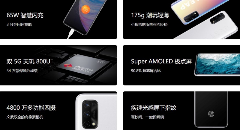 realme Q2 Pro 5G มาพร้อมกับหน้าจอ Super AMOLED ขนาด 6.4 นิ้ว ความละเอียด FHD+ ภายในขับเคลื่อนด้วยหน่วยประมวลผล Dimensity 800U, RAM 8GB + ROM 128/256GB พร้อมแบตเตอรี่ความจุ 4300mAh รองรับ 65W Dart Charge