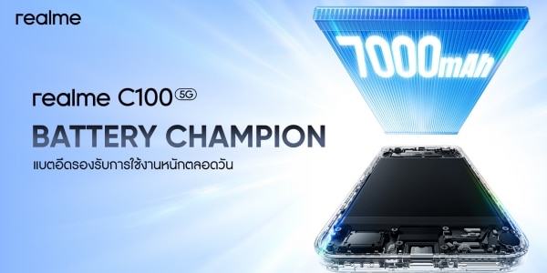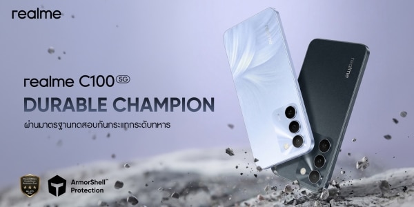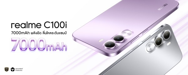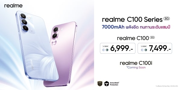 realme (เรียลมี) แบรนด์เทคโนโลยีเพื่อคนรุ่นใหม่ที่เติบโตเร็วที่สุดในโลก ประกาศเปิดตัวสมาร์ตโฟนสองรุ่นใหม่ใน C100 Series ทั้ง “realme C100 5G” และ “realme C100i” ที่ถูกพัฒนามาเพื่อสร้างมาตรฐานใหม่ในตลาดสมาร์ตโฟนระดับเริ่มต้น มาพร้อมกับสโลแกน “พลังอึด ทนทานระดับแชมป์” โดยเป็นสมาร์ทโฟนประสิทธิภาพสูงที่คุ้มค่าเกินราคาสุด ๆ ด้วยแบตเตอรี่ยักษ์แบบ Titan ความจุ 7000mAh ที่ออกแบบให้ยืนระยะนานถึง 6 ปี พร้อมปกป้องตัวเครื่องด้วยมาตรฐานระดับทหาร และฟีเจอร์ AI ที่พบเฉพาะในรุ่นเรือธง ซึ่งผู้ใช้จะได้ฟีเจอร์ทั้งหมดนี้ในราคาหลักพันเท่านั้น! โดยเฉพาะรุ่นใหญ่อย่าง C100 5G จะเน้นที่ประสิทธิภาพและความสามารถของเครือข่าย 5G เต็มรูปแบบ ส่วนรุ่นน้องอย่าง C100i ตอบโจทย์ผู้ใช้งานที่ต้องการฟีเจอร์ครบครันในราคาที่เข้าถึงได้ยิ่งขึ้น