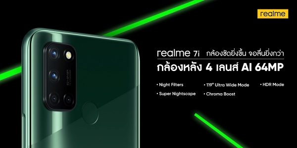 realme 7i ‘กล้องชัดยิ่งขึ้น จอลื่นยิ่งกว่า’ มาพร้อมกล้องหลัง AI 4 เลนส์ ความละเอียด 64 ล้านพิกเซล หน้าจอลื่นไหล 90Hz ขนาด 6.5 นิ้ว เสริมด้วยแบตเตอรี่ความจุ 5,000 mAh พร้อมโหมดประหยัดพลังงาน