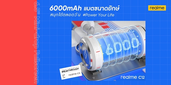 realme C12 ‘6000 mAh แบตทรงพลัง กล้องหลัง 3 เลนส์’ มาพร้อมความทรงพลังด้วยแบตเตอรี่ 6,000 mAh หน้าจอแบบ Mini-drop ขนาดกว้างถึง 6.5 นิ้ว ล้ำด้วยกล้องหลัง AI 3 เลนส์ความละเอียด 13 ล้านพิกเซล พร้อมโหมด Nightscape กล้องหน้าเซลฟี่ความละเอียด 5 ล้านพิกเซล