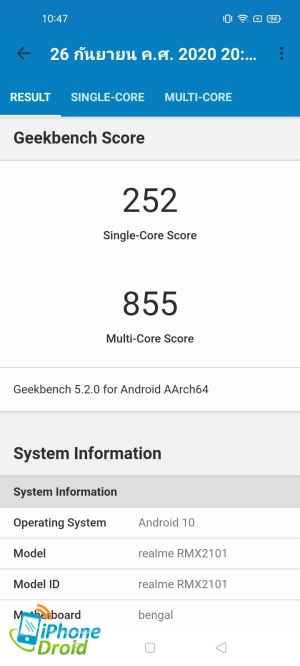 ส่วนผลการทดสอบด้วยโปรแกรม Geekbench 5 ทำคะแนนฝั่ง Single-Core ไปที่ 252 และคะแนน Multi-Core ที่ 855