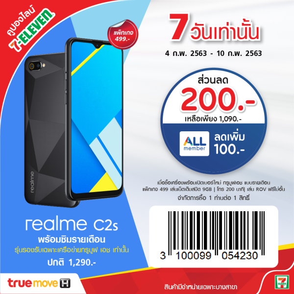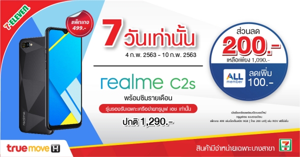 หลังจากวางจำหน่าย realme C2s ผ่าน 7-Eleven ไปเมื่อต้นปี ล่าสุดเพื่อเป็นเการตอบแทนกระแสตอบรับที่ดีเยี่ยม ทาง realme และ 7-Eleven จัดส่วนลดเพิ่ม จากราคาปกติ 1,290 บาท แถมฟรีหูฟัง เมื่อซื้อพร้อมซิม ทรูมูฟเอช แบบรายเดือน แพ็คเกจ 4G+ Extra FUN Unlimited 499 โดยจะลดเพิ่มจากราคาปกติอีก 200 บาท เหลือเพียง 1,090 บาท และพิเศษสุดๆ สำหรับลูกค้าที่เป็นสมาชิก All Member ลด On-top เพิ่มอีก 100 บาท เหลือเพียง 990 บาท