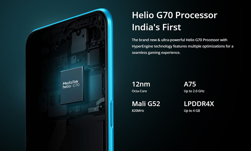 ภายในใช้หน่วยประมวลผล MediaTek Helio G70 Octa-core ขนาด 12 นาโนเมตร ความเร็ว 2.0GHz, RAM 3/4GB + ROM 32/64GB เพิ่ม MicroSD Card ได้สูงสุด 256GB และมีแบตเตอรี่ความจุ 5000mAh