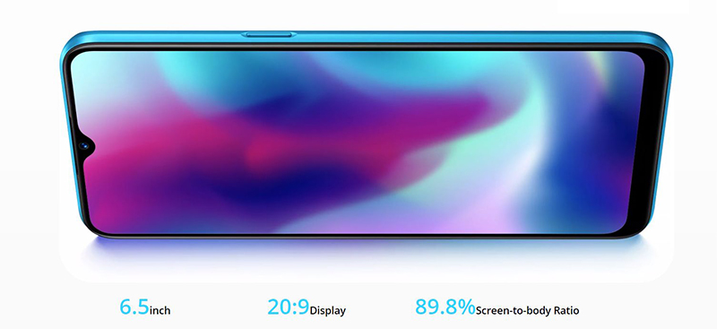 realme C3 มาพร้อมกับหน้าจอแสดงผล Mini-drop Fullscreen ชนิด LCD ขนาด 6.5 นิ้ว ความละเอียด HD+ (1600 x 720 พิกเซล) พื้นที่หน้าจอแสดงผลที่ 89.8%